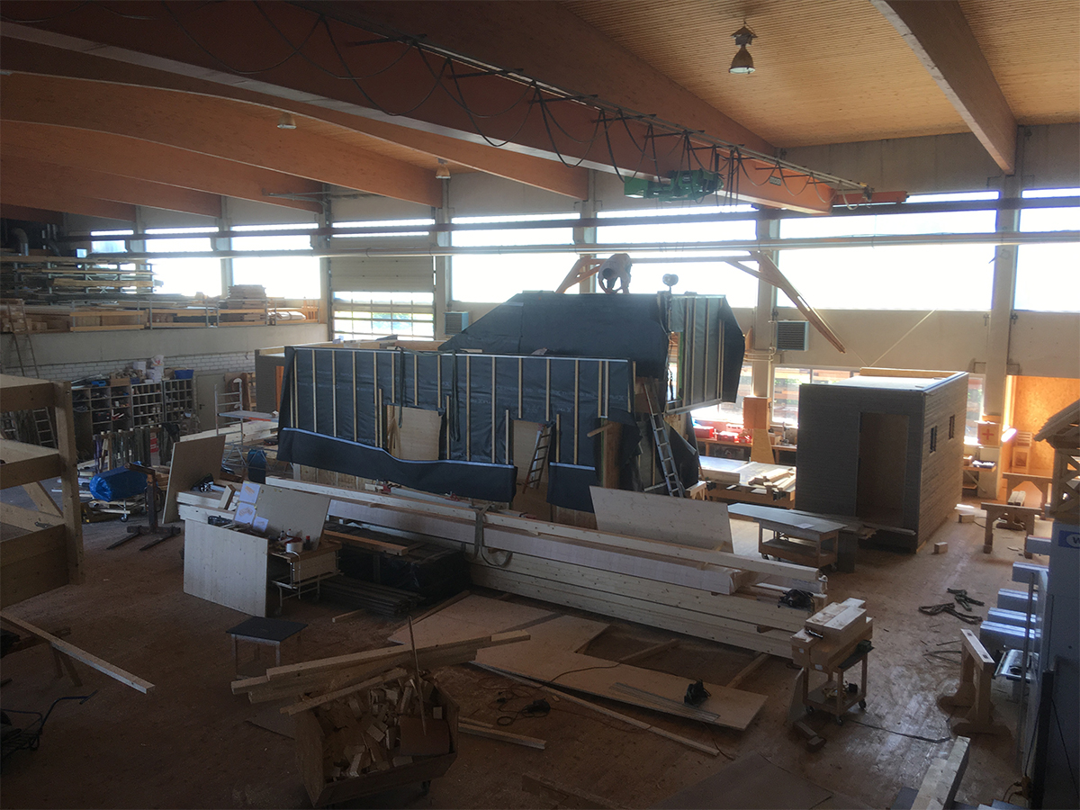 Das Holz für die Elemente wurde von der Abbundanlage zugeschnitten und die Konstruktion nahezu vollständig in unserer Produktionshalle vorgefertigt. Wand-, Decken- und Bodenelemente entstanden witterungsunabhängig unter kontrollierten Bedingungen. Die Wände wurden innen mit 3-Schichtplatten beplankt und außen für die spätere Montage der Fassadenverschalung aus vorvergrauter Nut- und Feder-Holzschalung in horizontaler Ausführung vorbereitet.