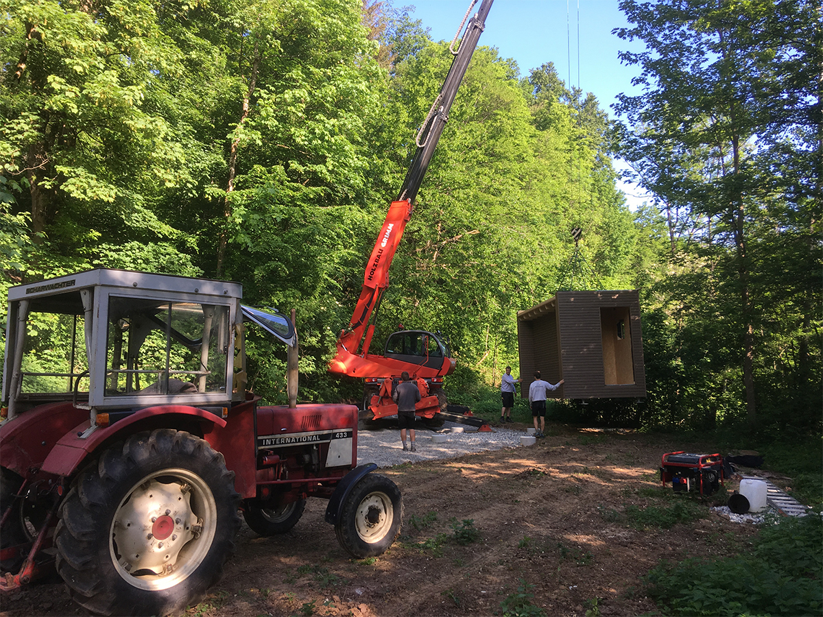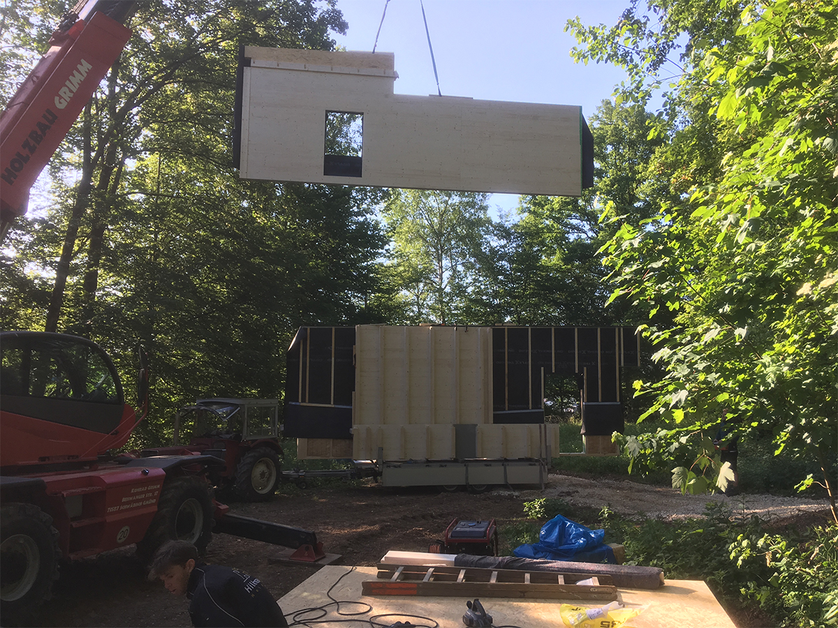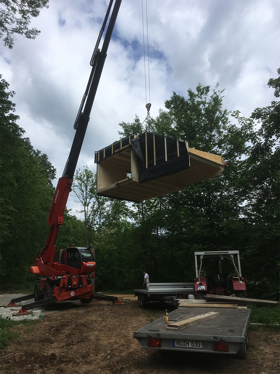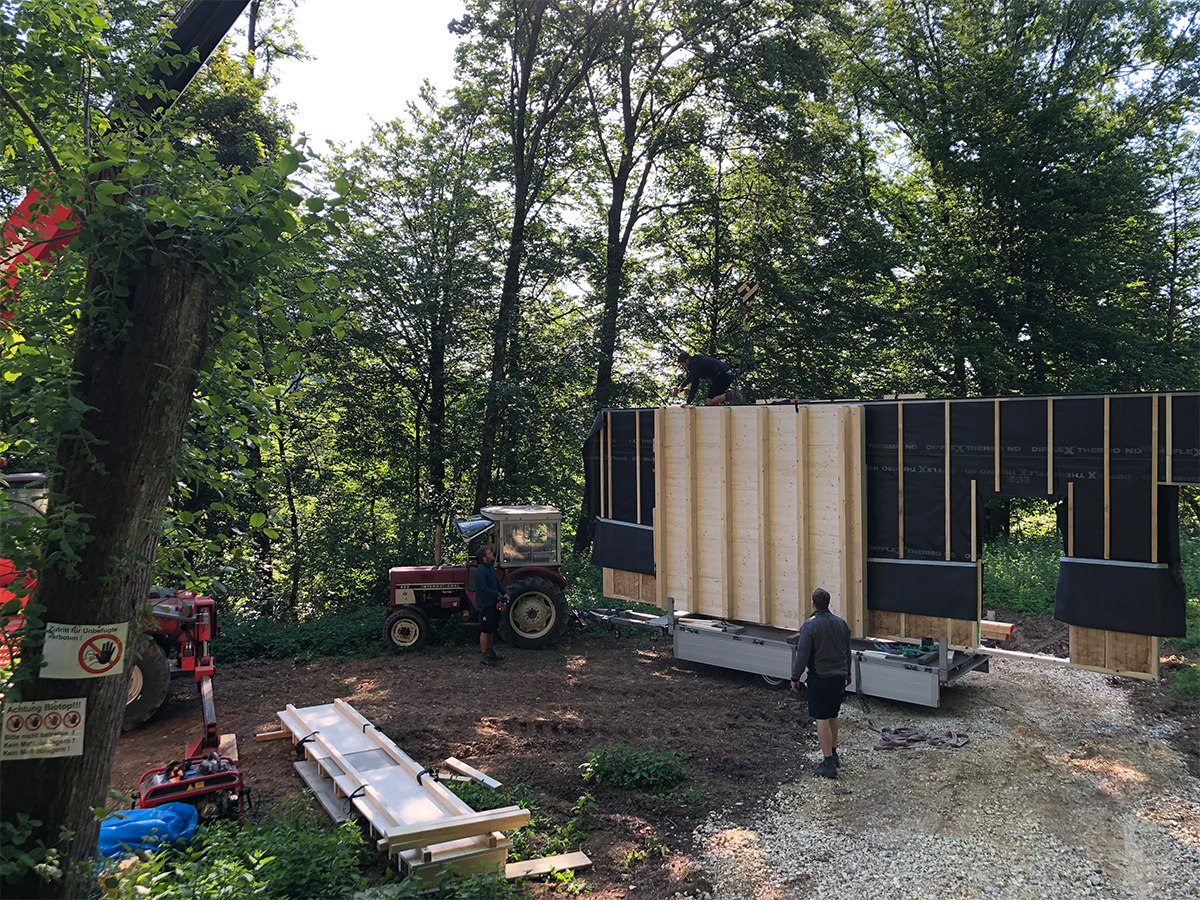 Vor Ort kam zusätzlich ein Teleskopstapler zum Einsatz, mit dem die vorgefertigten Wand- und Deckenelemente entladen und direkt in ihre Endposition gehoben wurden. So konnte die Montage auch unter schwierigen Geländebedingungen effizient, sicher und platzsparend erfolgen.