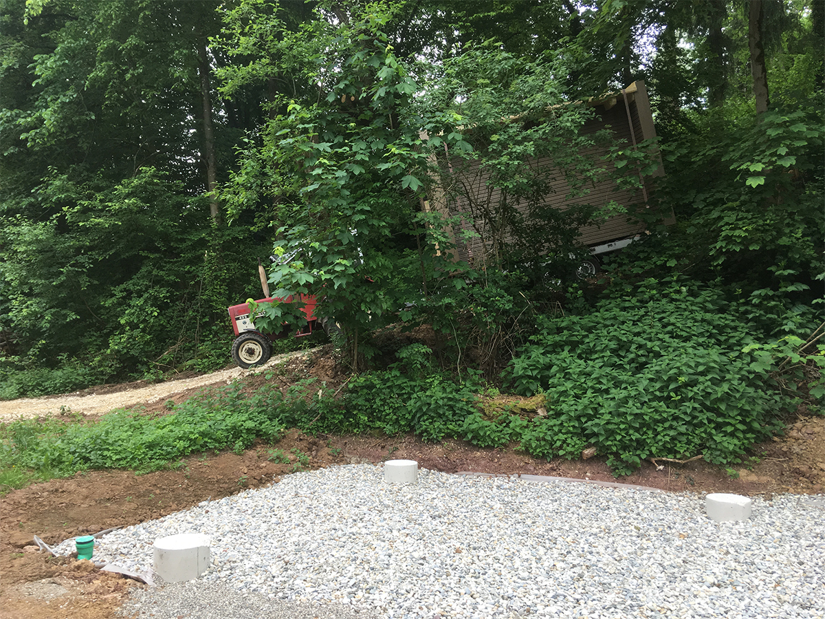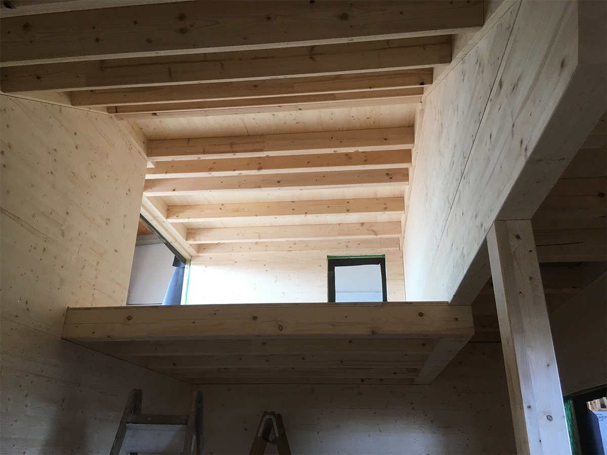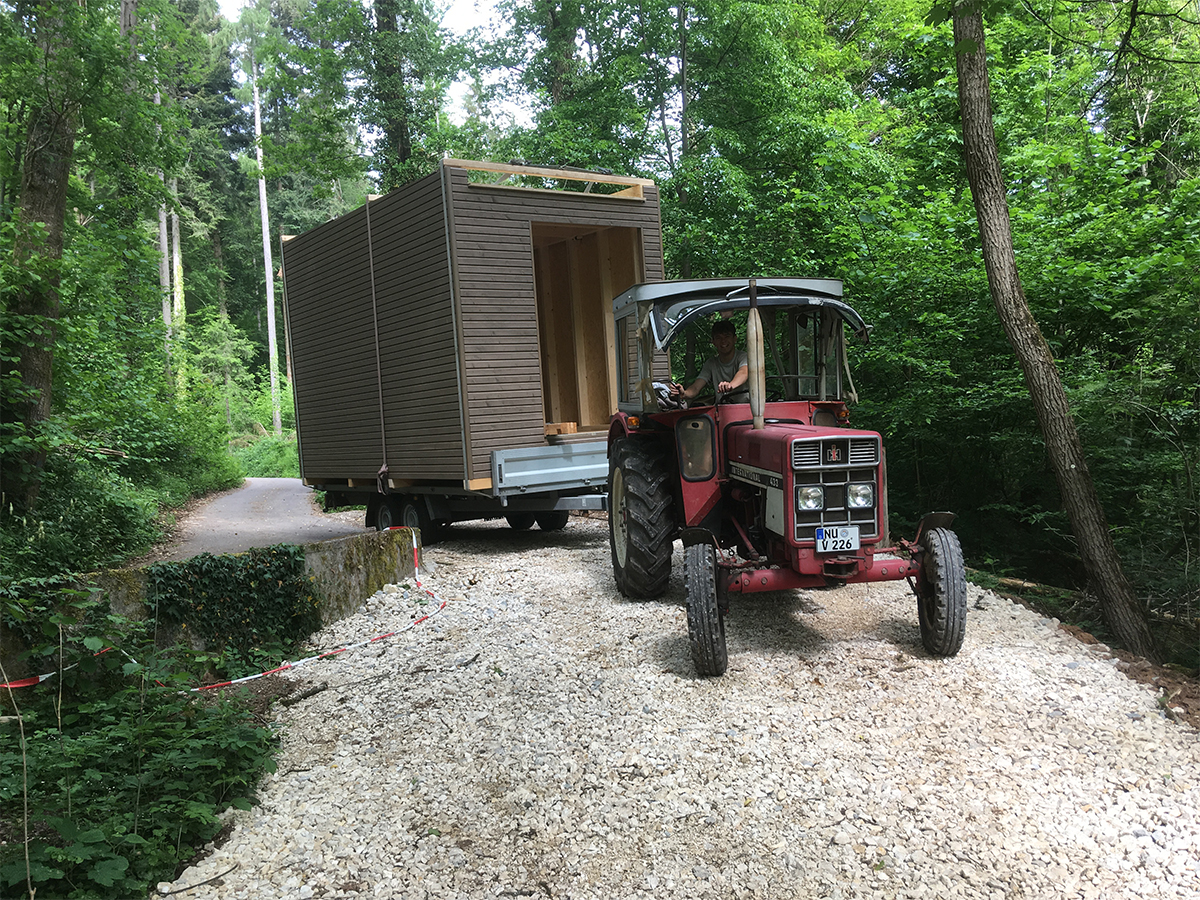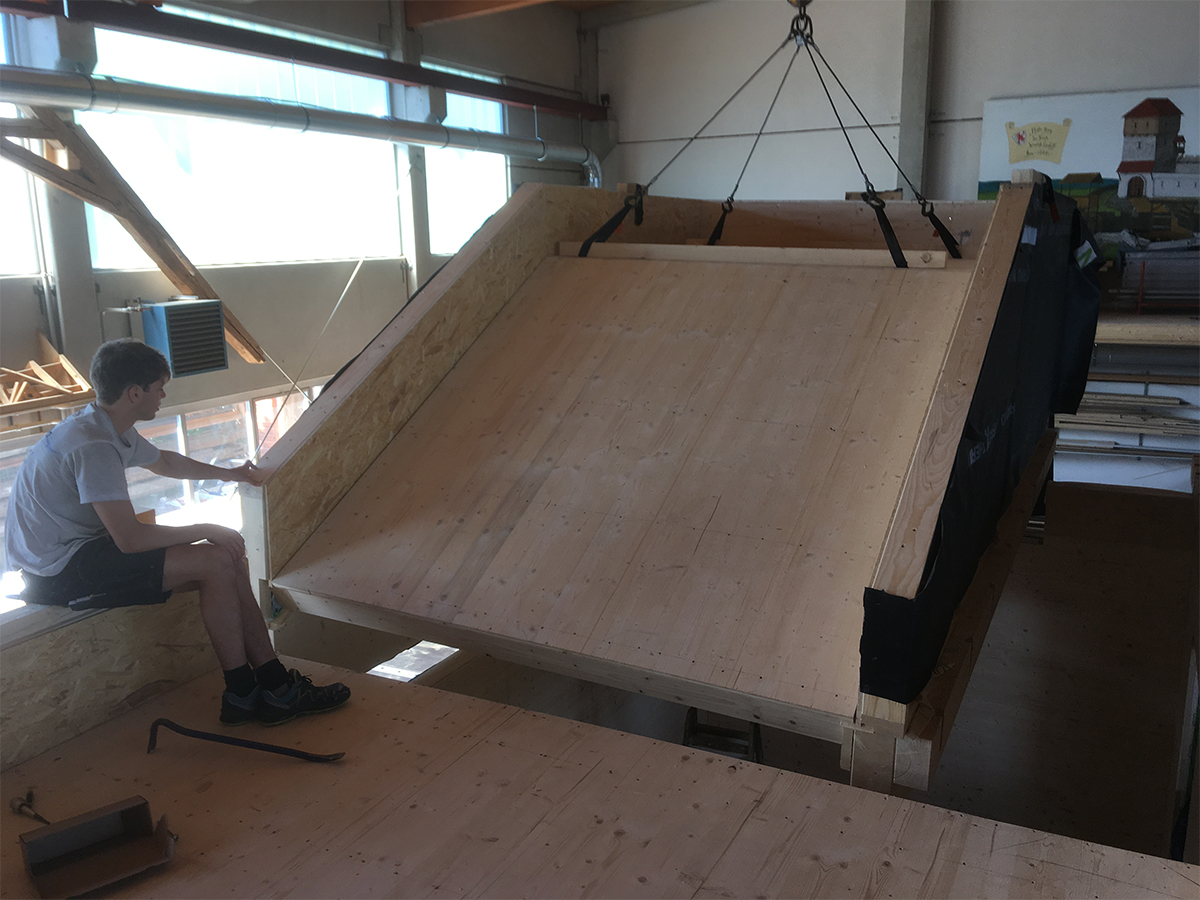 Vor Ort kam zusätzlich ein Teleskopstapler zum Einsatz, mit dem die vorgefertigten Wand- und Deckenelemente entladen und direkt in ihre Endposition gehoben wurden. So konnte die Montage auch unter schwierigen Geländebedingungen effizient, sicher und platzsparend erfolgen.