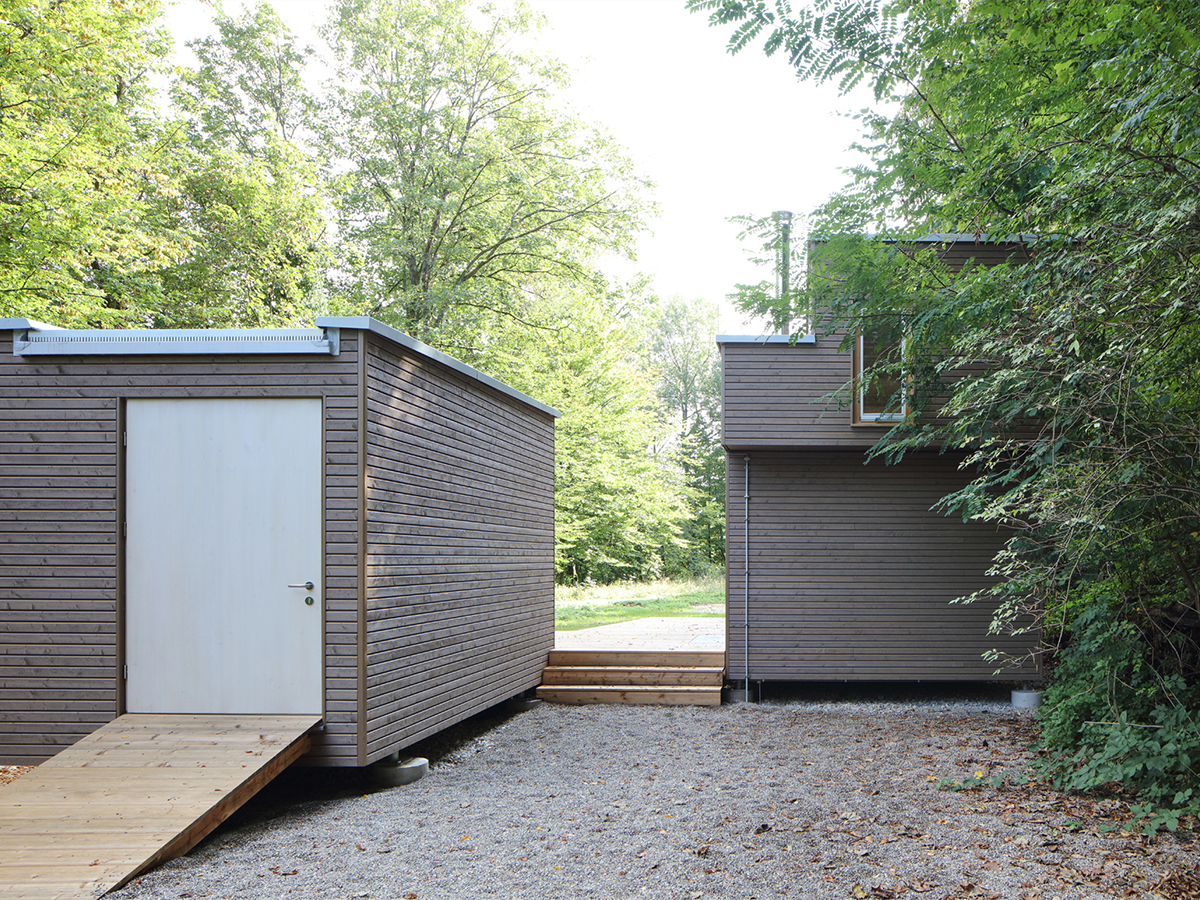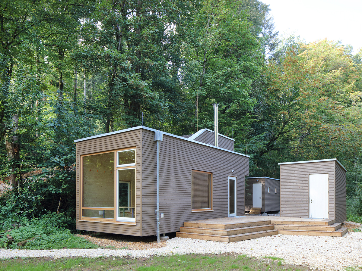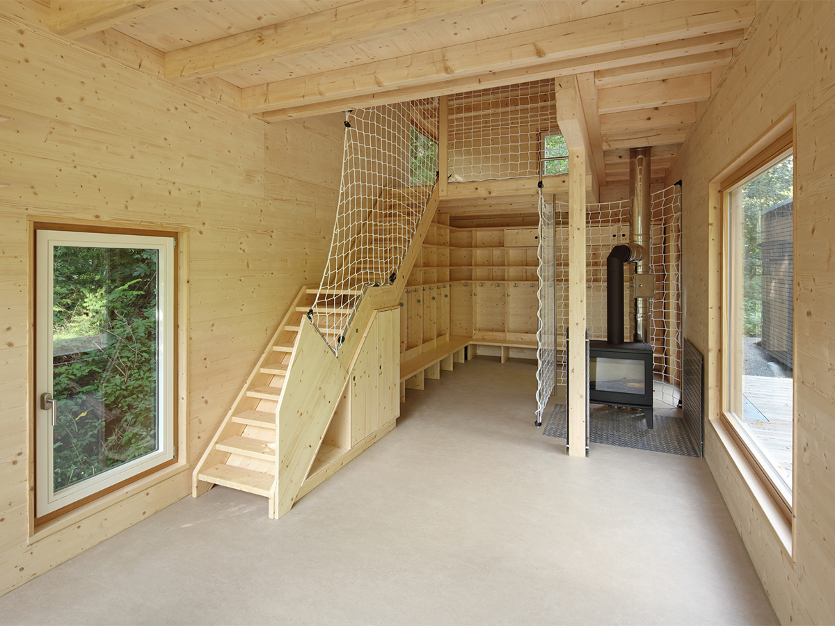 Die Holzbalkendecken und Bodenelemente wurden ebenfalls komplett vorproduziert. Die Gebäude stehen auf Punktfundamenten, um den Eingriff in den Waldboden auf ein Minimum zu reduzieren.