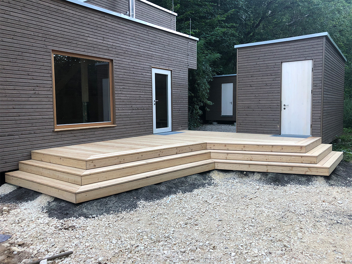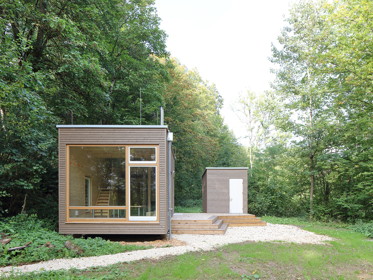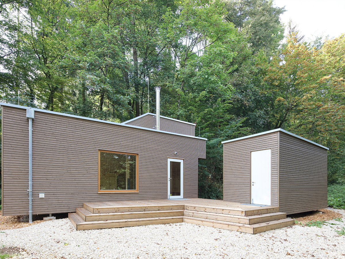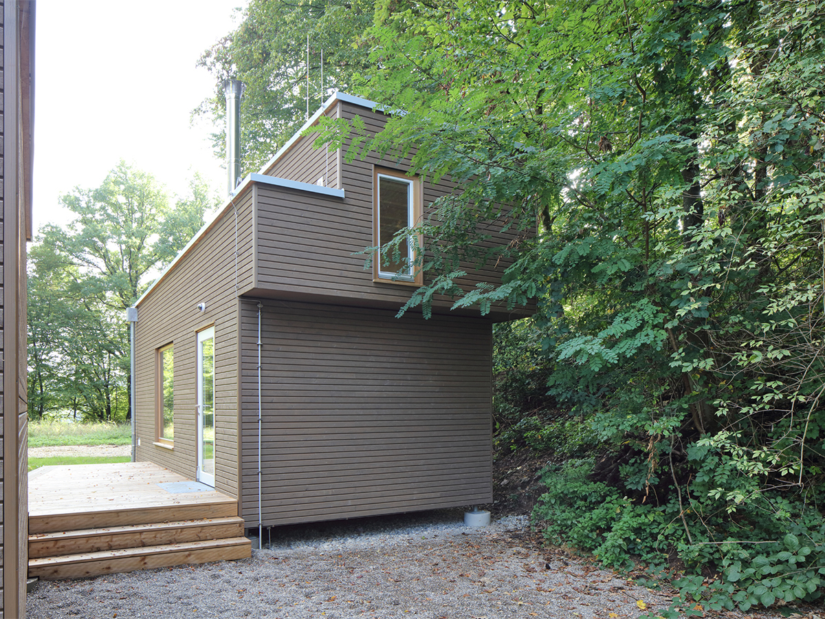 Die Holzbalkendecken und Bodenelemente wurden ebenfalls komplett vorproduziert. Die Gebäude stehen auf Punktfundamenten, um den Eingriff in den Waldboden auf ein Minimum zu reduzieren.